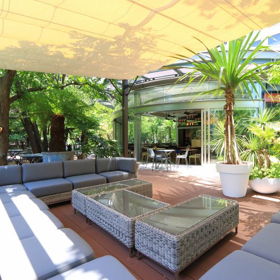 夏はテラス席でのお食事がオススメです!大きなサンシェードがありますので、日差しも気にせずにお楽しみ頂けます!座り心地の良い大きなふかふかソファーで、まるでシンガポールのリゾートにいるかのような贅沢気分を(一部スポットエアコン、ミスト扇風機あり)